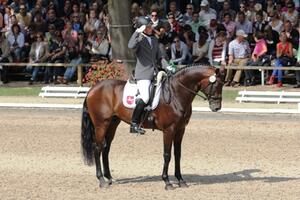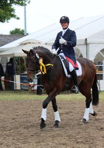 Das vergangene Wochenende stand ganz im Zeichen der Dressur. Besondere Erwähnung verdient heute der erst 7-jährige Don Darius. Absolut souverän und lektionssicher präsentierte sich der bewegungsgewaltige Braune unter Mike Habermann in der Dressurprüfung der Klasse S* in Alvern. Mit großartigen 70,405% und der goldenen Schleife belohnten die Richter diese tolle Runde. Youngster Fürstenhof konnte sich in der Reitpferdeprüfung mit seiner Reiterin Birte Senftleben mit einer Wertnote von 7,9 Platz zwei sichern. In der Dressurpferdeprüfung der Klasse A legte das eingespielte Paar noch eine Schippe drauf und holte sich mit einer 8,4 den Sieg. Auch Strahlemann und Topvererber Spörcken ging dieses Wochenende in Alvern an den Start und glänzte unter Ole Köhler mit schick und Lektionssicherheit. Zwei Mal Platz drei lauteten die Ergebnisse in der Dressurpferdeprüfung der Klasse L und M. Hans-Peter Klaus und Londonhit starteten ebenfalls in diesen beiden Prüfungen. Das Paar lieferte zwei gute Runden ab, die ihnen in der Dressurpferdeprüfung der Klasse L den neunten und in der Dressurpferdeprüfung der Klasse M den sechsten Platz bescherten.